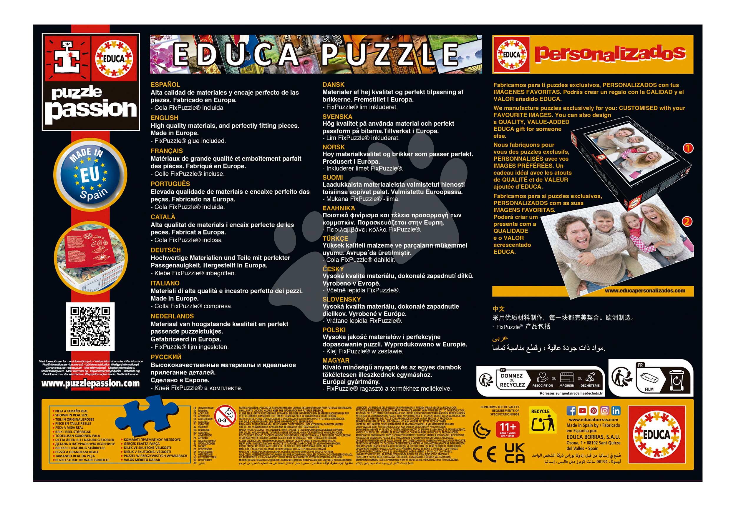 Educa spezialisiert sich vor allem auf die Herstellung von Puzzles und Lernspielen – bietet viele schöne Puzzles für verschiedene Altersgruppen, die in keiner Sammlung fehlen dürfen. Mit den Puzzles von Educa müssen Sie sich keine Sorgen mehr um verlorene Teile machen. Bis zu 16 Teile sendet der Hersteller Educa auf Anfrage über das Formular kostenlos zu jedem Puzzle nach, das die entsprechende Kennzeichnung auf der Schachtel trägt.